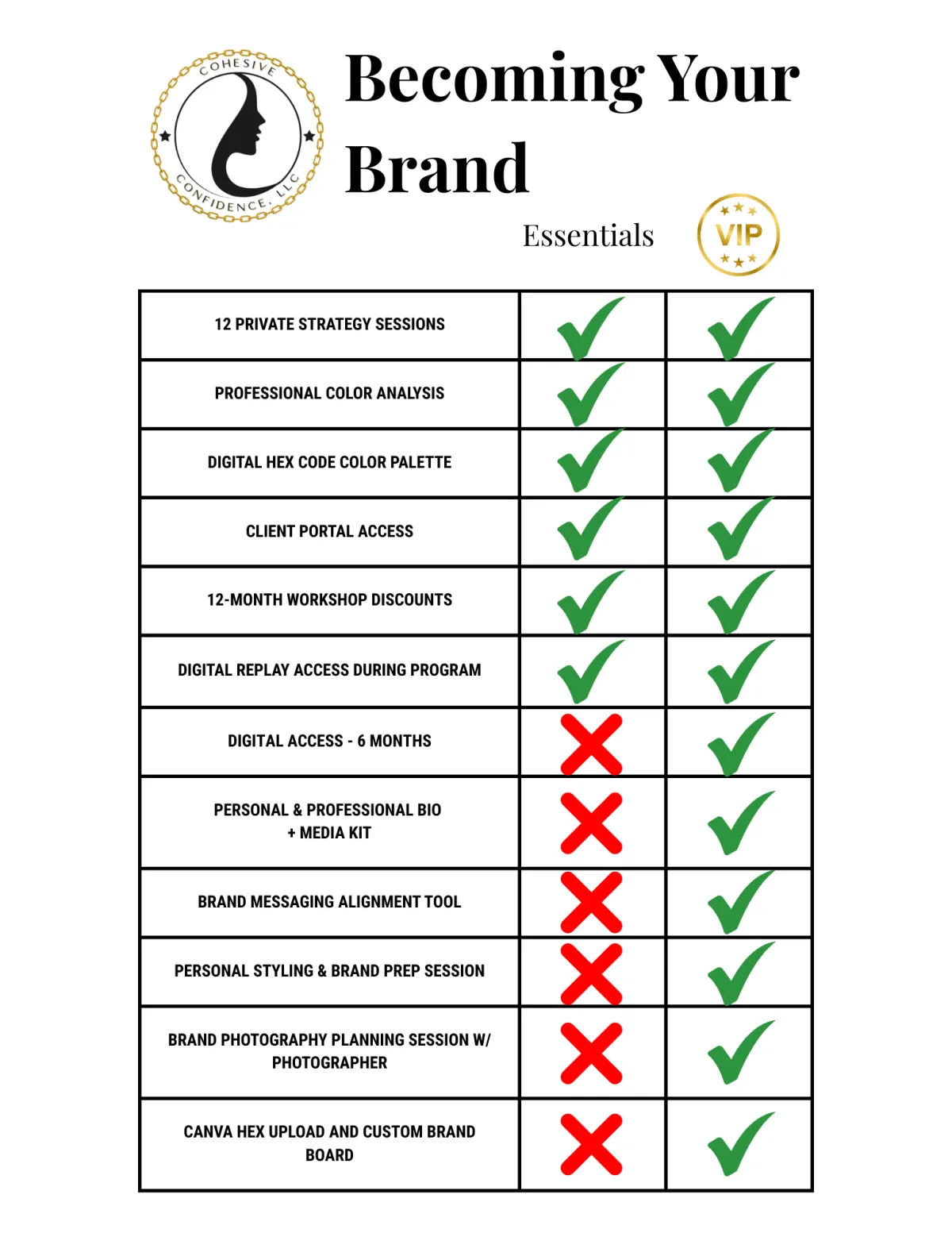 The VIP Experience includes all of what is offered within the Essentials, PLUS done-with-you brand assets, custom bios, a media kit, and elevated color analysis tools. VIP clients will also receive photoshoot support and tools to audit future brand decisions. Think of the VIP as the TOTAL PACKAGE: you walk away not just with the strategy but also with polished, ready-to-use assets that bring all of the elements to life with Cohesive Confidence.